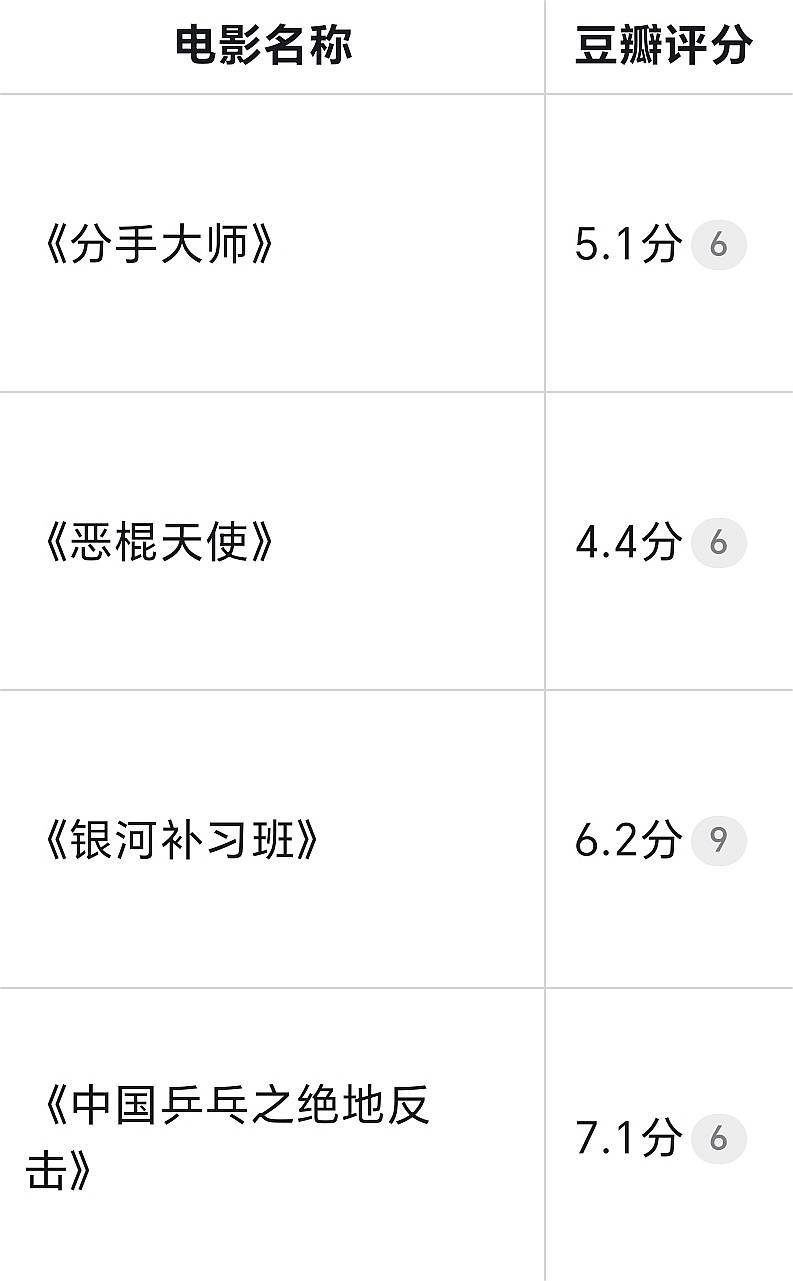 2014年 的《分手大师》 豆瓣评分5.1分,2015年 《恶棍天使》豆瓣评分 4.4分,2019年 《银河补习班》豆瓣评分 6.2分 ,2023年 《中国乒乓之绝地反击》 7.1分 ,这是邓超作为导演的成绩。